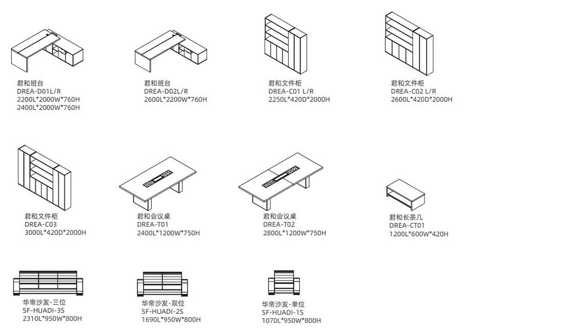 會議桌基礎造型與班臺類似,中部使用深色實木貼皮。桌腿為實木材質,中間為走線系統,中間雙側翻蓋金屬線盒,滿足多方位使用者的需求。